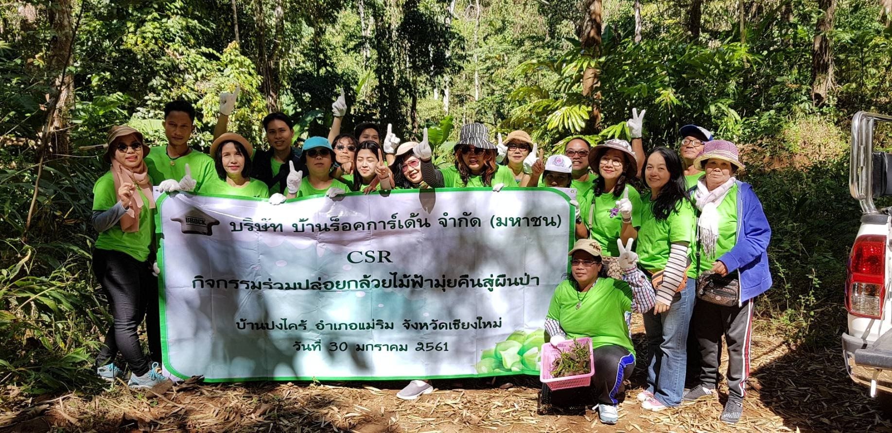 บริษัท บ้านร็อคการ์เด้น จำกัด (มหาชน) ได้จัดกิจกรรมบำเพ็ญประโยชน์เพื่อสังคมและสิ่งแวดล้อม ณ ชุมชนบ้านปงไคร้ หมู่ที่ 5 บ้านปงไคร้ ตำบลโป่งแยง อำเภอแม่ริม จังหวัดเชียงใหม่ ซึ่งเป็นสถานที่อนุรักษ์กล้วยไม้ฟ้ามุ่ย ซึ่งเป็นพันธุ์พืชพื้นเมืองในชุมชนบ้านปงไคร้ โดยบริษัทร่วมกับผู้นำชุมชนและคนในชุมชน ทำการปล่อยกล้วยไม้ฟ้ามุ่ยคืนสู่ผืนป่า ซึ่งบริษัทมีวัตถุประสงค์เพื่อปลูกจิตสำนึกในการอนุรักษ์พันธุ์พืชพื้นเมืองของชุมชน และเข้าใจถึงประโยชน์ของการอนุรักษ์พันธุ์พืชพื้นเมือง ตลอดจนรณรงค์และส่งเสริม หรือเผยแพร่ประชาสัมพันธ์การท่องเที่ยวที่ยั่งยืน